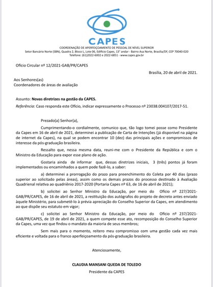 A presidente da CAPES, Cláudia Queda de Toledo, informou a representantes da academia, por meio de ofício circular em 20 de abril, já haver implementado três pontos de sua carta de intenções. São eles: a prorrogação do prazo do Coleta, a restituição da proposta de alteração do decreto de estrutura da Fundação e o pedido de recomposição do Conselho Superior, ato de competência do ministro da Educação.