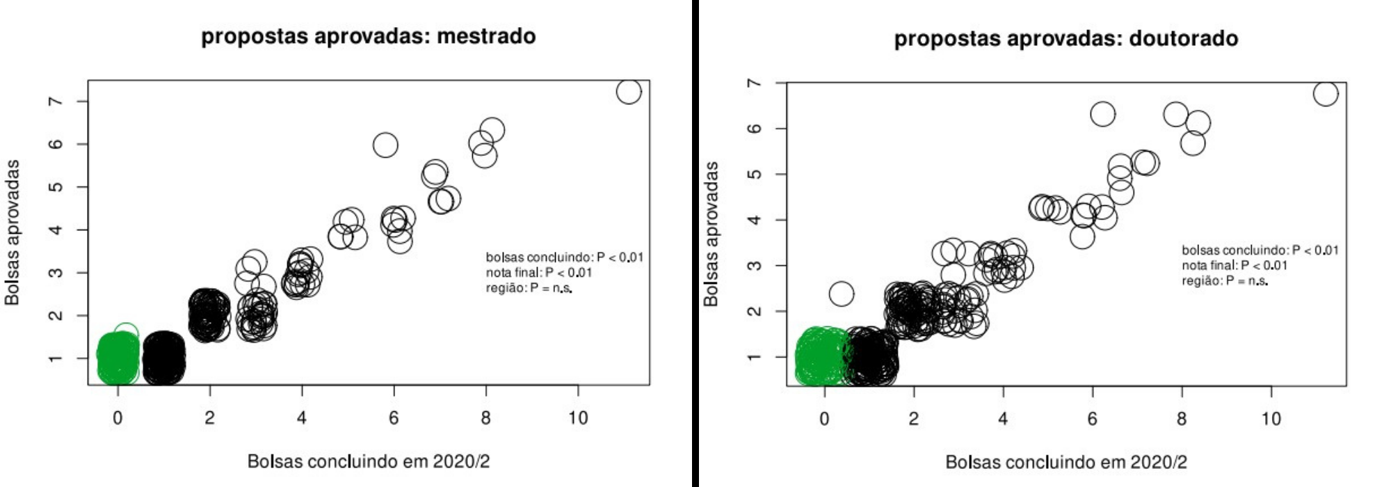 A análise dos dados revela que o número de bolsas aprovadas foi afetado (i) pelo número de bolsas que estavam concluindo no 2º semestre de 2020 e (ii) pela nota final obtida. Ao mesmo tempo, não houve efeito algum da região geográfica de origem do curso.
